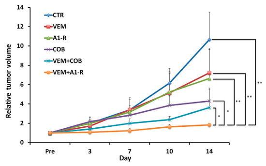 Tumor growth curves of the treated and untreated BRAF-V600E mutant melanoma PDOX. Line graph shows tumor volume at each point relative to the initial tumor volume. Please see Materials and Methods section for drug dose, route and schedule. ** p < 0.01, * p < 0.05. Error bars = SD [9].