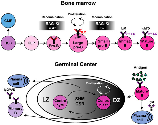 B-cell precursors are generated from hematopoietic stem cells (HSCs) in the liver during the fetal life and postnatally in the bone marrow (BM) through an ordered developmental pathway [1]. The differentiation pathway from HSCs to mature B cells can be divided into several stages. HSCs give rise to two predominant populations: the common myeloid progenitor (CMP) and the common lymphocyte progenitor (CLP). It is from CLPs that B cells arise [2] (Figure 1). The expression of B lineage-associated genes, as well as the survival and expansion of committed B-cell progenitors, is controlled by transcriptional factors including PU.1, Ikaros, E2A, EBF, and Pax5 [3,4]. In the BM, committed B cells develop from pro-B-cells to pre-B cells and from pre-B cells to immature B cells [5]. The early phase of B-cell differentiation is characterized by the assembly of the immunoglobulin (Ig) heavy-chain (H) and light-chain (L) gene segments through the process of V(D)J recombination, which brings together three gene segments termed: variable (V), diversity (D), and joining (J) segments [6,7].