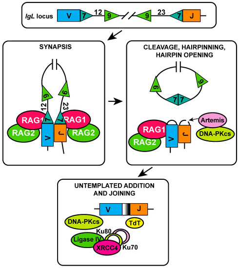 Molecular mechanism of V(D)J recombination. Schematic representation of immunoglobulin light chain loci (IgL) showing a V gene segment flanked by 12-base pair (bp) spacer recombination signal sequence (RSS) and a J gene segments flanked by a 23-bp spacer RSS. The recombination activating gene 1/2 complex (RAG1/2) forms a synaptic complex with a 12-bp spacer RSS and a 23-bp spacer RSS, resulting in nicking and hairpin formation at the coding ends. RSS heptamers are joined to form a signal joint. Artemis is required for coding end hairpin opening and is activated by the DNA protein kinase catalytic subunit (DNA-PKcs). Upon hairpin opening, terminal deoxynucleotidyl transferase (TdT) adds untemplated nucleotides and increases junctional diversity. Ends are sealed by non-homologous end joining (NHEJ), requiring Ku70 (depicted in pink), Ku80 (depicted in light green), XRCC4, DNA ligase IV, and DNA-PKcs.