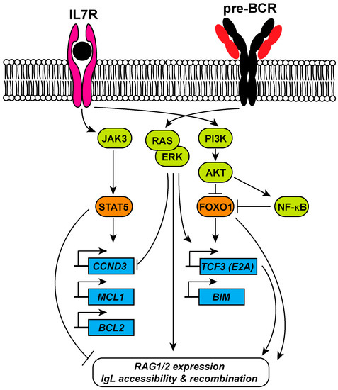 RAG expression has a dynamic pattern throughout B-cell development, in which phases of proliferation are separated from phases of recombination, in order to ensure genomic integrity [41]. Balance between the signaling pathways emanating from the pre-BCR and the interleukin-7 receptor (IL7R) are required for this dynamic pattern of RAG expression and activity [42,43]. In the BM, the developing B cells proliferate in response to IL7R signaling pathway through activation of janus kinase 3 (JAK3) and signal transducer and activator of transcription 5 (STAT5), which in turn stimulates the transcription of Ccnd3 (encoding cyclin D3). Binding of cyclin D3 to Cdk4 and Cdk6 induces transition from the G1/S checkpoint of the cell-cycle and DNA replication [42]. In addition to stimulating proliferation, STAT5 enhances pro-B-cell survival by activating expression of anti-apoptotic genes encoding Mcl1 and Bcl2 [44]. STAT5 also has an inhibitory effect on Igκ recombination. Furthermore, activation of the PI3K-AKT signaling pathway by IL7 leads to phosphorylation and subsequent degradation of FOXO1, a major transcription factor for RAG1/2 expression, and in this way inhibits recombination. Repression of FOXO1 also mediates IL7-induced pro-B-cell survival by inhibition of BIM expression [45]. In contrast, signaling from the pre-BCR represses proliferation and induces IgL recombination. Activation of RAS/ERK downstream of pre-BCR represses cyclin D3 and drives expression of the E2A transcription factor. E2A cooperates with interferon regulatory factor 4 (IRF4), downstream of B-cell linker protein (BLNK), to increase Igκ locus accessibility (Figure 3). The exact regulatory mechanism of these transcription factors downstream of IL7R and pre-BCR, and their involvement in early B-cell development, has been reviewed extensively and will not be covered here [42,46]. Altogether, the interplay between these two signaling pathways ensures the inhibition of RAG expression during proliferation in order to conserve genomic stability in pre-B cells.