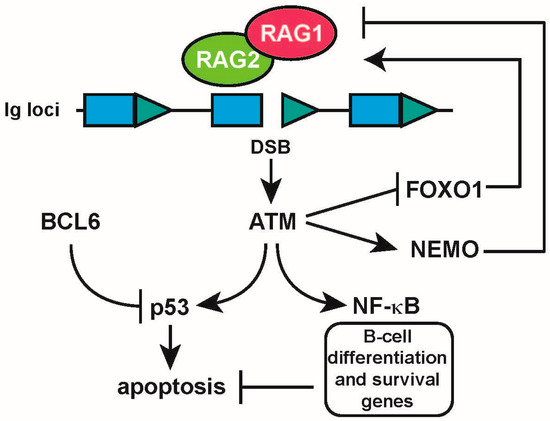 Using NHEJ deficient (Artemis−/−, Ku70−/−, and Scid) Abelson kinase (Abl) transformed pre-B cells, the Sleckman group found that Rag-induced DSBs regulates the expression of a large number of genes, and activates a broad genetic program in developing pre-B cells, partially through the ATM-dependent activation of NF-κB, which in turn regulated the expression of several important B-cell differentiation factors [72]. These results argue that, in addition to being required for V(D)J recombination, RAG-dependent programmed DSBs can also be regarded as important developmental cues for B-cell development, implicating the DDR not only as a mechanism to detect and instigate repair of DNA damage but also as an important regulator of B-cell differentiation (Figure 4).