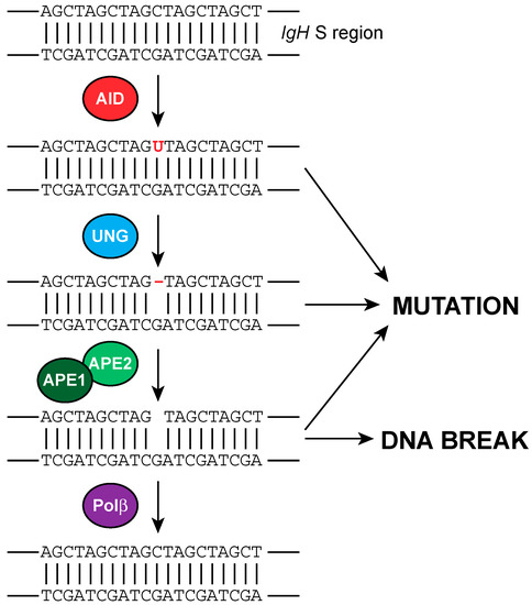 - Schrader, C.E.; Guikema, J.E.; Wu, X.; Stavnezer, J. The roles of APE1, APE2, DNA polymerase beta and mismatch repair in creating S region DNA breaks during antibody class switch. Philos. Trans. R. Soc. Biol. Sci. 2009, 364, 645–652. [Google Scholar] [CrossRef] [PubMed]
