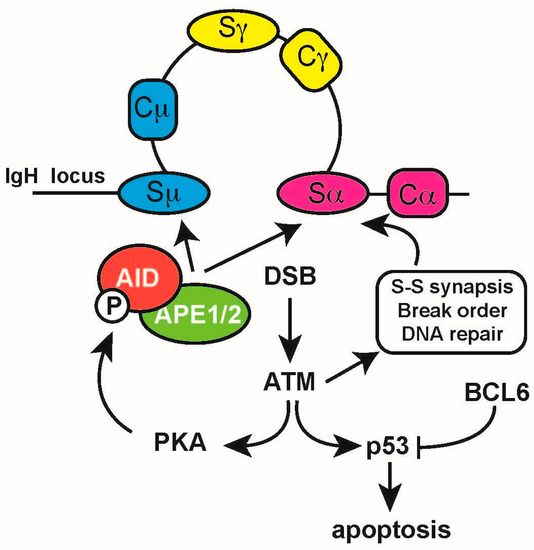 - Basu, U.; Chaudhuri, J.; Alpert, C.; Dutt, S.; Ranganath, S.; Li, G.; Schrum, J.P.; Manis, J.P.; Alt, F.W. The AID antibody diversification enzyme is regulated by protein kinase A phosphorylation. Nature 2005, 438, 508–511. [Google Scholar] [CrossRef] [PubMed]