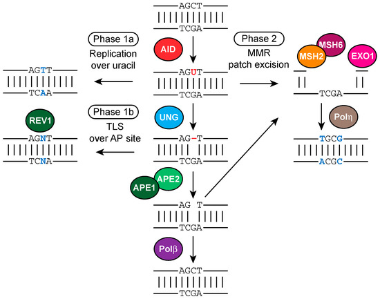 Like CSR, SHM is mechanistically initiated by AID and both BER and MMR components are required for this process to occur [130,143]. During SHM, mutations are introduced in two distinct phases, depending on the context of U:G mismatch processing (Figure 7). Mutations at G:C bps are termed Phase 1 mutations, and A:T mutations occur in Phase 2. Phase 1 mutations can be triggered by replication over AID-generated U:G mismatches, giving rise to C-to-T and G-to-A transition mutations (Phase 1a). For these mutations to take place U:G mismatches either need to escape faithful repair in the G1 phase, or AID deaminates cytosines in S phase. Several reports argue for the former possibility as AID is degraded more quickly in S phase than in the G1 phase, and AID-dependent DSBs have been predominantly detected in the G1 phase [109,144]. Phase 1a mutations do not depend on BER or MMR, in contrast to Phase 1b and Phase 2 mutations (Figure 7).