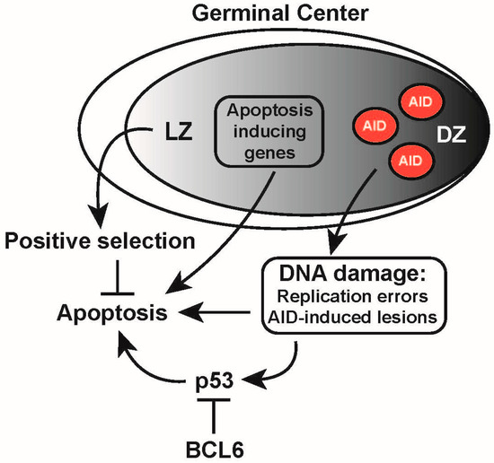 DNA damage response regulation in the germinal center. In the germinal center, centroblast undergo rapid proliferation, and expression of activation-induced cytidine deaminase (AID) is initiated. Moreover, centroblasts in the dark zone (DZ) and centrocytes in the light zone (LZ) are prone to undergo apoptosis as they express apoptosis-inducing genes (indicated in the black frame), such as FAS and BAX, and lack expression of the anti-apoptotic gene BCL2. During affinity maturation in the germinal center reaction, B cells that acquire sufficient T-cell help, based on the affinity of their B-cell receptors, are positively selected and rescued from apoptosis. At the same time, DNA damage caused by replication errors and AID-induced lesions (indicated in the black box) trigger a DNA damage response that may activate a p53-dependent apoptosis response, which is counteracted by the B-cell lymphoma 6 (BCL6) protein. Arrows represent positive regulation (activation); T-bars represent negative regulation (inhibition).