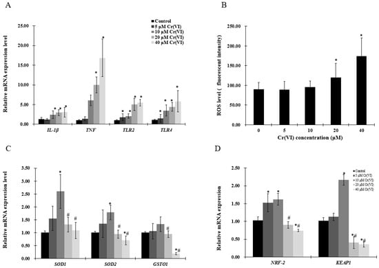 The mRNA levels of tumor necrosis factor (TNF) and interleukin 1-β (IL-1β ) were increased in a concentration-dependent manner (Figure 2A,B). As pro-inflammatory cytokines are driven by toll-like receptor (TLR)-mediated signals, TLR2 and TLR4 expression was examined by real-time qPCR, which showed that both TLR2 and TLR4 mRNA levels were significantly upregulated (Figure 2A). Cells stained with CellROX® Green and analyzed by a plate reader revealed that Cr(VI) increased ROS levels in a concentration-dependent manner (Figure 2B). However, the antioxidant enzymes superoxide dismutase (SOD1, SOD2), glutathione S-transferase O 1 (GSOT1), nuclear respiratory factor 2 (NRF-2) and kelch like ECH associate protein 1 (KEAP1) mRNA levels were upregulated at Cr(VI) concentrations up to 10 μM, which tended to decrease at 20 μM (Figure 2C,D).