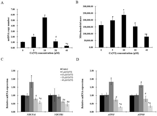 To evaluate mitochondrial biogenesis, mtDNA copy number and mitochondrial mass were examined. Increase in mtDNA copy number and mitochondrial mass was observed in HepG2 cells exposed to up to 10 μM of Cr(VI), followed by a decrease at 20 μM (Figure 3A,B). Mitochondrial function was assessed by complex I (NADH: ubiquinone oxidoreductase subunit A1 (NDUFA1) or NADH: ubiquinone oxidoreductase subunit B1 (NDUFB1)) and complex V (ATP synthase, H+ transporting, mitochondrial Fo complex subunit F6 (ATP5J) or ATP synthase, H+ transporting, mitochondrial F1 complex, O subunit (ATP5O)). The mRNA level of NDUFA1, but not of NDUFB1, was significantly increased at concentrations up to 10 μM of Cr(VI), while the highest concentration produced statistically significant decrease of both NDUFA1 and NDUFB1. ATP5J and ATP5O mRNA expression was upregulated at concentrations up to 10 μM of Cr(VI), but decreased at 20 μM (Figure 3D).