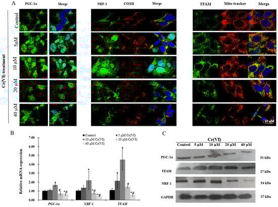 One hundred thousand cells were plated in the 24-well plate with coverslip in 500 μL of medium, and after reaching 80% confluence, they were treated with different concentrations of Cr(VI) for 24 h. Cells were fixed in 4% paraformaldehyde, washed twice in PBS and then blocked for 30 min in blocking solution (10% goat serum, 1% BSA, 0.15% saponin in PBS) at room temperature. They were incubated with primary antibody PGC-1α (1:50, Santa Cruz Biotechnology, Santa Cruz, CA, USA), NRF-1 (1:50, Santa Cruz Biotechnology), COXII (1:50, Santa Cruz Biotechnology) and TFAM (1:50, Santa Cruz Biotechnology) for 24 h at 4 °C; washed 3 times with PBS, and incubated with Goat anti-Mouse IgG/IgM(H+L) secondary antibody, Alexa Fluor 488, 1:500, or Goat anti-Rabbit IgG/IgM(H+L) secondary antibody, Alexa Fluor 568, 1:500, (Thermo Fisher Scientific) for another 1 h at room temperature. Nuclei were stained with Hoechst for 5 min, and mounted on slides with coverslips. Images were taken using a Zeiss UV-LSM 510 confocal microscope (Zeiss, Oberkochen, Germany).