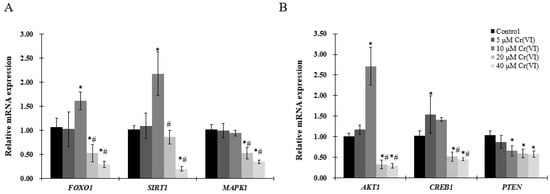 Effects of Cr(VI) on genes involved in regulatory pathways of mitochondrial biogenesis in HepG2 cells. mRNA expression levels were detected by real-time qPCR. (A) gene expression of FOXO1, SIRT1, and MAPK1; (B) gene expression of AKT1, CREB1, and PTEN. Data are presented as mean ± SME of the values obtained in three independent experiments, each using triplicate cultures. After outlier analysis, the number of values used in the calculation of the corresponding mean varied from six to nine. * Compared with control, * p < 0.05; # compared with 2 μM of Cr(VI) treatment group, # p < 0.05. Abbreviations: threonine kinase 1, AKT1; forkhead box class-O, FOXO1; mitogen-activated protein kinase 1, MAPK1; silent information regulator-1, SIRT1; phosphatase tensin homolog, PTEN.