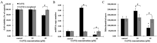 Hexavalent chromium (Cr(VI)) is widely distributed in the environment and commonly used in industries. It has been demonstrated that Cr(VI) can cause lung cancer through occupational exposure to contaminated air []. However, the general population is exposed to Cr(VI) through consumption of contaminated drinking water, which results in severe public health issues []. The United State National Toxicology Program conducted short-term and long-term toxicity and carcinogenicity studies on Cr(VI) in drinking water, and reported that Cr(VI) caused oral and small intestine cancer, and liver injury in rodents []. Human oral exposure to Cr(VI) has been shown to produce hepatotoxicity and provided evidence that Cr(VI) accumulation occurs mostly in the liver—The largest detoxification organ by oral exposure route [,]. Moreover, Cr(VI) may cause primary liver cancer and increase the risk of deterioration of cancer patients [,]. The mechanism of Cr(VI)-induced hepatotoxicity is still not fully understood. Previous studies indicated that Cr(VI) could cause liver damage through the formation of DNA double-strand breaks and Cr-DNA adducts in the nuclear DNA []. It has also been shown that mitochondrial dysfunction could be caused by Cr(VI) exposure: Cr(VI) could reduce mitochondrial DNA (mtDNA) copy number and inhibit mitochondria electron transport chain complex I, resulting in perturbation of mitochondrial respiration and redox homeostasis [,]. These reports indicate that mitochondrion is one of the most sensitive targets of Cr(VI) toxicity.