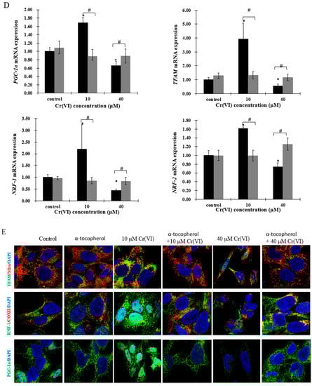 Cr(VI) perturbed mitochondrial biogenesis, an effect restored by α-tocopherol in HepG2 cells. (A) Cell viability was assessed by resazurin reduction assays; (B) mtDNA copy number was measured by real-time qPCR; (C) mitochondrial mass of HepG2 cells exposed to Cr(VI) was detected by NAO fluorescence intensity; (D) gene expression related to mitochondrial biogenesis was quantified by real-time qPCR; (E) the upper panels show images of cells co-incubated with TFAM (green) and Mito-tracker (red); the middle panels show images of cells co-incubated with NRF-1 (green) and COXII (red); and the lower panels show images of PGC-α (green). Images were captured by confocal microscopy with a 63× objective, scale bar: 10 μm. Data are presented as mean ± SME of the values obtained in three independent experiments, each using triplicate cultures. After outlier analysis, the number of values used in the calculation of the corresponding mean varied from six to nine. * Compared with control, * p < 0.05; # Compared with Cr(VI) treatment group, # p < 0.05. Abbreviations: nuclear respiratory factor 1, NRF-1; peroxisome-proliferator-activated receptor γ coativator-1 α, PGC-1α; mitochondrial transcription factor A, TFAM.