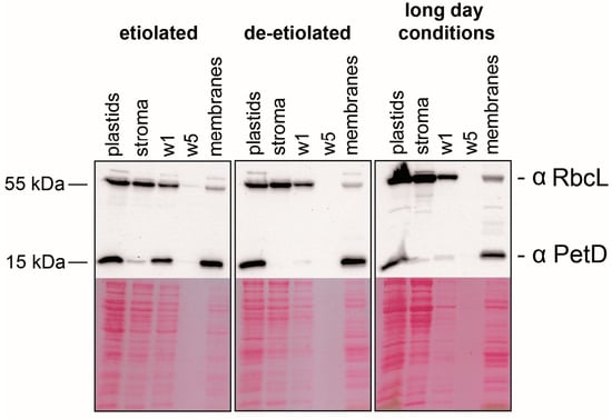 We prepared membranes and stroma extracts from isolated plastids from 9-day-old Zea mays seedlings that were either grown in the dark (i.e., are etiolated), from greening seedlings (grown in the dark and then irradiated for 16 h, then kept in the dark for an 8 h night and harvested next morning after an additional 75 min of light exposure), or from plants grown under standard long-day conditions. The three tissue types represent etioplasts, greening plastids, and mature chloroplasts, respectively. The fractions were analyzed immunologically for the presence of the marker proteins PetD and RbcL (Figure 1). PetD is a membrane protein of the cytochrome b6f complex; RbcL is a stromal protein. There is a slight signal for PetD in stroma from etiolated plants, while the protein is beyond the detection limit in the two other stroma preparations. A small fraction of RbcL can be found within each membrane fraction, indicating a slight contamination of our membrane preparation with stromal proteins. Nevertheless, this immunological analysis shows successful enrichment for both, membrane and stroma proteins, in the two fractions.
