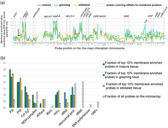 While most RNAs within the top 10% membrane-enriched fraction are encoding proteins with photosynthetic functions, there are also interesting exceptions, namely rps14 and cemA. Both are represented by multiple probes within the top 10% MEV probes. rps14 is the only mRNA coding for a ribosomal protein that shows such high enrichment in membranes (Table S2). It is suggested that the cemA gene product is required for the import of inorganic carbon across the envelope membrane, but it was not found to be attached to membranes in recent ribosome profiling analysis [14]. Both rps14 and cemA are part of main peaks in this analysis, represented by multiple probes corresponding to the psaA/B and the cemA–petA operon (Figure 2a). rps14 is accumulating as part of a tricistronic transcript together with psaA and psaB and cemA is located within an operon adjacent to petA. petA and psaA/B encode core membrane proteins of photosystem I and the cytochrome b6f complex. Thus, rps14 and cemA are likely drawn to the membrane as part of a larger transcript tethered to the thylakoid membrane via translated psaA/B and petA, respectively.