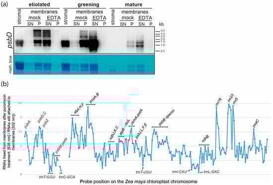 The suggested mechanism of membrane association of chloroplast mRNAs is via actively translating ribosomes [7,9,14]. To test directly for the importance of ribosomes for mRNA-membrane association, we treated membranes with ethylenediaminetetraacetic acid (EDTA) to separate the small and large subunit of the ribosome and thus disrupt membrane and mRNA association. RNA retrieved from supernatants and membranes after EDTA treatment was analyzed by RNA gel blot hybridization using a probe specific for the psbD gene (Figure 3a). We observed that in mock-treated samples, the signal for psbD mRNAs is almost completely retained in the membrane fractions. Only shorter transcripts of 1.0 to 1.5 kb are found in the stroma of etiolated and greening tissue. These transcripts likely represent monocistronic psbD (the psbD coding region is 1.0 kb in length) and are in excess of longer precursors. Possibly, such abundant shorter transcripts are not all engaged with ribosomes and can thus partially remain in the stroma. Larger transcripts encompassing psbD, psbC and further genes are only found in membrane fractions prior to EDTA treatment, which could be explained by their more efficient translation relative to the smaller monocistronic RNAs. After EDTA treatment, no psbD remains detectable in membranes and the RNA is instead found in the supernatant. This is further evidence for ribosomes being required for membrane attachment of chloroplast mRNAs. Still, it cannot be ruled out that larger ribonucleoprotein (RNP) granules that would co-enrich with membranes despite a physical interaction, dissolve due to EDTA treatment and are thus released in the supernatant. Such granules have been described in Chlamydomonas reinhardtii [21].