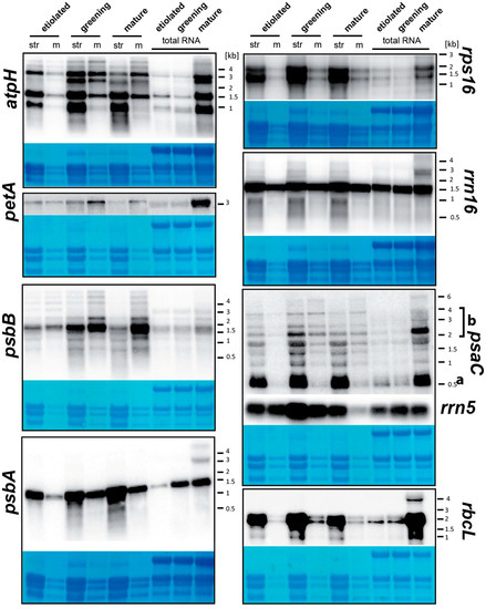 Total RNA was extracted from etiolated, deetiolated and green tissue with TRIzol reagent (Invitrogen, Carlsbad, CA, USA) according to the manufacturer’s instructions. For each individual sample a pool of collected leaves was used. Five micrograms of total RNAs from tissue or RNAs extracted from stroma and membrane fractions were separated on an agarose gel containing 1.2% formaldehyde and transferred to uncharged nylon membranes (Hybond N, GE Healthcare, Little Chalfont, UK). After transfer, the blots were UV cross-linked (150 mJ/cm2) and then stained with methylene blue to check RNA integrity and loading.