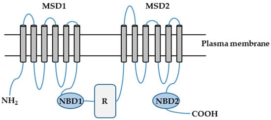CFTR is a cAMP- and cGMP-regulated chloride (Cl−) and bicarbonate (HCO3−) channel localized primarily at the apical surfaces of epithelial cells lining the airways, gut, and exocrine glands, where it is responsible for the transepithelial salt and water transport [4,5,6]. CFTR is a member of the ATP-binding cassette (ABC) transporter superfamily and consists of 1480 amino acids. CFTR is composed of two repeated motifs; each consisting of a six-helix membrane-spanning domain (MSD) and a cytosolic nucleotide binding domain (NBD). These two motifs are linked by a cytoplasmic regulatory (R) domain, which contains multiple consensus phosphorylation sites (Figure 1) [4,7,8].