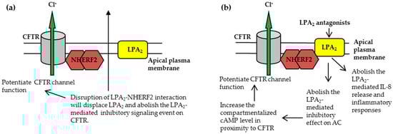 The CFTR-NHERF2-LPA2 complex could be targeted to attenuate the LPA2-mediated inhibitory signaling on CFTR channel function and/or suppress the LPA2-mediated IL-8 release from airway epithelial cells. These two effects are beneficial to CF therapy. (a) The approach to disruption of NHERF2-LPA2 interaction; (b) The approach to antagonism of LPA2.