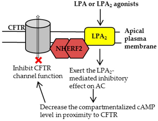 Li et al. [16] demonstrated for the first time that (i) wild-type (WT)-CFTR forms a macromolecular complex with NHERF2 and LPA2 at the apical plasma membrane of intestinal epithelial cells (HT29-CL19A) and airway epithelial cells (Calu-3); (ii) LPA inhibits the CFTR Cl− channel function (using a CFTR-mediated iodide efflux assay) through an LPA2-mediated Gi pathway; (iii) LPA inhibits the CFTR-dependent short-circuit currents (Isc) in polarized epithelial cells in a compartmentalized manner; (iv) LPA inhibits the CFTR-dependent Isc in mouse intestinal epithelia tissues; (v) Administration of LPA substantially reduced the cholera toxin (CTX)-induced and CFTR-mediated intestinal fluid secretion in mice; and (vi) disruption of this complex using an LPA2-specific peptide, which contains the last 11 amino acids at the C-terminus of LPA2 and serves as a disruptor of LPA2-NHERF2 interaction in cells, reversed the LPA2-mediated inhibition of CFTR channel function in cells [16]. This study not only discovered the molecular mechanism underlying the coupling of LPA2-mediated inhibitory signaling to CFTR Cl− channel function at the apical plasma membrane of airway and intestinal epithelial cells (Figure 2), but demonstrated that LPA substantially reduced the CTX-induced intestinal fluid secretion in vivo, which had clinical implications for treating human diseases associated with the hyperactivation of CFTR channel function (e.g., secretory diarrhea).