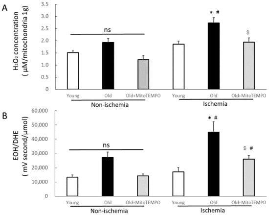Because the increase in mitochondrial ROS is assumed to be a major factor in the decline of blood flow with ischemia, we initially measured the level of mitochondrial H2O2 in the non-ischemic and ischemic skeletal muscles of young, old, and MitoTEMPO-treated old mice in post-operative day (POD) 2. There was no significant difference among the three groups in non-ischemic skeletal muscles. Under ischemic conditions, the level of mitochondrial H2O2 was elevated in only the old mice compared to non-ischemic conditions. Moreover, the level of mitochondrial H2O2 was higher in the old mice than in young mice under ischemic conditions. MitoTEMPO treatment decreased the level of mitochondrial H2O2 to the level of young mice (Figure 1A). Since mitochondria are the major source of ROS in aging tissues [,]. Mitochondrial-targeted antioxidants may contribute to decreased ROS in tissues. To determine whether MitoTEMPO could reduce ROS in tissues, we measured the levels of superoxide in the hind limb by the ultra-performance liquid chromatography (UPLC) method. The levels of superoxide in non-ischemic hind limb tissue did not differ among the three groups. The level of superoxide was elevated in the ischemic hind limb of old mice compared to non-ischemic mice (p = 0.029). MitoTEMPO-treated old ischemic muscle also had a tendency to have a higher superoxide level than non-ischemic muscle, though these changes were not statistically significant (p = 0.293). The levels of superoxide in tissue extracts under ischemia were higher in old mice than in young mice, and those were attenuated by MitoTEMPO treatment (44,948.1 ± 7266.3 vs. 17,008.5 ± 3133.1 and 26,004.0 ± 2234.3 mVs/μmol, respectively, n = 10, p < 0.05; Figure 1B).