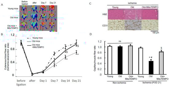 Senescence is an irreversible risk factor for most forms of cardiovascular and peripheral artery disease (PAD) [,,]. Previous reports demonstrated aging-dependent impairment of blood flow with critical limb ischemia [,]. However, this mechanism remains complicated. Oxidative stress increase with age is one of the causes of vascular dysfunction []. Age-dependent increases in oxidative stress occur through multiple mechanisms, including mitochondrial dysfunction. The mitochondria are major sources of reactive oxygen species, which are increased in aging animals [,]. This increase in mitochondrial reactive oxygen species (ROS) is associated with the oxidation of the electron transport system (ETS) complex V, leading to decreased ATP production [,] and increased DNA oxidative damage [,]. Moreover, in PAD patients, mitochondrial dysfunction and increased oxidative stress-induced damage have been reported [,]. Taken together, it seems that the resolution of mitochondrial ROS in aged mammals is attributed to collateral growth under ischemia through the recovery of mitochondria or other signaling pathways. In contrast, transient or low levels of ROS also act as mediators of angiogenesis through the hypoxia-inducible factor (HIF)-vascular endothelial growth factor (VEGF)/VEGF receptor-2 signaling pathway and the VEGF-independent pathway, the latter of which involves the generation of lipid oxidation products []. Therefore, we performed the present study to examine whether mitochondrial ROS scavenging maintains blood flow following acute hind limb ischemia in aged mice. In this study, limb perfusion recovery in old mice treated with MitoTEMPO was observed compared to young and old mice. MitoTEMPO is a superoxide scavenger accumulated in the mitochondria []. MitoTEMPO was previously used in vivo in mice to treat hypertension-induced endothelial dysfunction [,]. We demonstrated the mechanism of angiogenesis with regard to p53 and the peroxisome proliferator-activated receptor γ coactivator-1α (PGC-1α) pathway as well as HIF-VEGF signaling. In addition, we elucidated the effect of mitochondrial ROS in aging with respect to mitochondrial DNA (mtDNA) and apoptosis.