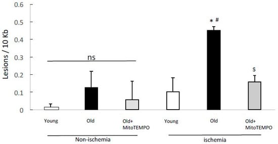mtDNA is highly susceptible to oxidative stress because of the absence of protective histones, leading to more vulnerable nuclear DNA. Mitochondrial ROS increase with age and are associated with oxidative mitochondrial DNA damage and endothelial/vascular dysfunction []. To examine whether MitoTEMPO treatment prevented the mtDNA damage induced by aging and ischemia, we performed different length quantitative PCR for the mtDNA of both ischemic and non-ischemic skeletal muscles. mtDNA damage was increased in old mice compared to young mice and MitoTEMPO-treated old mice (0.45 ± 0.02 vs. 0.10 ± 0.08 and 0.15 ± 0.03 lesions/10 kb, n = 10, p < 0.05, respectively) after ischemia but not in non-ischemic skeletal muscles on POD 2 (Figure 3). These results suggest that mtDNA damage induced by ischemia increases with senescence, but is suppressed by mitochondrial superoxide scavenging.