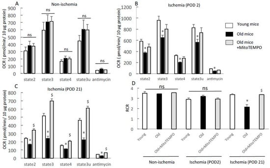 It has been controversial that whether aging is related to impairment of mitochondrial respiration in skeletal muscle [,,,,]. How ischemia alters the mitochondrial respiration profile in aging skeletal muscle is not fully understood. Moreover, the effect of mitochondrial ROS scavenging for ischemic skeletal muscle is unclear. Thus, we examined the change in the mitochondrial respiration profile of ischemic skeletal muscles using a XF24 flux analyzer (Seahorse Bioscience, North Billerica, MA, USA). We chose the soleus to minimize errors because mitochondrial respiratory function is muscle type specific and the soleus is primarily composed of slow twitch fibers []. In non-ischemic skeletal muscles, mitochondrial respiration via complex II, including states 2, 3, 4, and 3u and in response to antimycin A, did not differ among young, old, and Mito-TEMPO-treated old mice (Figure 4A). In ischemic skeletal muscles of POD 2, the respiration rate of each state was higher in young mice than old mice (Figure 4B). MitoTEMPO-treated old mice had a tendency to have higher respiration rates compared to non-treated one. In ischemic skeletal muscles at POD 21, the respiration rate of each state was higher in young mice than in old mice. Furthermore, MitoTEMPO treatment significantly preserved mitochondrial respiration compared to no treatment (Figure 4C). These data suggest that MitoTEMPO treatment in old mice could preserve mitochondrial respiration under ischemia to a similar level as that of young mice. The respiratory control ratio (RCR, state 3/state 4) is an index of coupling for diagnosis of ETS defects, indicating the efficiency of ATP production in the presence of ADP. In ischemic skeletal muscles at POD 21, the mitochondria of old mice displayed a lower RCR value than those of young mice, and MitoTEMPO treatment elevated RCR value to the level as young mice (Figure 4D). The RCR value of both non-ischemic and ischemic skeletal muscles at POD 2 revealed no differences among the three groups (Figure 4D). These data suggested that MitoTEMPO treatment for old mice might have contributed to the preservation of ATP production through ETS in chronically ischemic skeletal muscle.