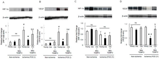 HIF-1α and VEGF levels are known to decrease with aging [,]. According to previous reports, excessive oxidative stress can impair VEGF-induced angiogenesis in endothelial cells []. To examine the proangiogenic effect of mitochondrial superoxide scavenging, we examined the expression of HIF-1α and VEGF by Western blot analysis. In non-ischemic skeletal muscles, the expression of HIF-1α (Figure 5A) and VEGF (Figure 5B) did not differ among young, old, and MitoTEMPO-treated old mice. However, at POD 2 after ischemia, HIF-1α and VEGF expression (Figure 5A,B) were significantly induced in young mice. The elevation of HIF-1α and VEGF expression were suppressed in old mice, which were recovered by MitoTEMPO treatment. These data suggest that mitochondrial superoxide scavenging is associated with elevated HIF-1α and VEGF expression in old skeletal muscle. The expression of HIF-1α and VEGF in old mice at day 21 after ischemia were lower than those of non-ischemic old mice (Figure 5C,D). In ischemic conditions, the expression of HIF-1α in old mice was not different from that in young mice. In addition, the magnitude of HIF-1α was smaller than that in POD 2 in the same conditions. Therefore, we propose that the contribution of HIF-1α to angiogenesis is rare in the late phase of ischemia.