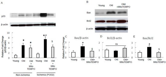 The protein expressions of p53, B-cell leukemia/lymphoma 2 (Bcl2) and Bcl2-associated X (Bax). The expression of p53 was analyzed by Western blotting in non-ischemic and ischemic (POD 2) skeletal muscle from young, old, and MitoTEMPO-treated old mice. The p53 expression was higher in old mice compared to young mice for non-ischemic and ischemic (POD 2) skeletal muscles. MitoTEMPO treatment attenuated the elevation of p53 after induction of ischemia (A). The expression of the proapoptotic factor Bax and the antiapoptotic factor Bcl2 was analyzed by Western blotting in the ischemic (POD 2) skeletal muscles of young, old, and MitoTEMPO-treated old mice. Representative images of Bax and Bcl2 (B) and the summarized findings after quantification of Bax/β-actin (C); Bcl2/β-actin (D) and Bax/Bcl2 (E). The Bax/Bcl2 ratio was significantly higher in old mice compared to young mice. MitoTEMPO treatment decreased the Bax/Bcl2 ratio to a similar level to that of young mice. The values are expressed as the means ± S.E.M. n = 10, each. * p < 0.05 vs. young mice, $ p < 0.05 vs. old mice, # p < 0.05 vs. non-ischemic skeletal muscle. ns indicates no significant difference.