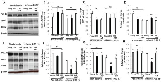 The protein expressions of peroxisome proliferator-activated receptor γ coactivator-1α (PGC-1α), nuclear respiratory factor (NRF)-1 and estrogen-related receptor α (ERRα). The expression of PGC-1α, NRF-1 and ERRα was analyzed by Western blotting in the non-ischemic and ischemic (POD 2 and 21) skeletal muscles of young, old, and MitoTEMPO-treated old mice. Representative images of PGC-1α, NRF-1 and ERRα for POD 2 (A) and POD 21 (E) and the summarized findings after quantification of PGC-1α/β-actin ((B,F) POD 2, 21, respectively), NRF-1/β-actin ((C,G) POD 2, 21, respectively) and ERRα/β-actin ((D,H) POD 2, 21, respectively). For POD 2, the expression of PGC-1α, NRF-1 and ERRα did not differ among the three groups. For POD 21, the expression of PGC-1α, NRF-1 and ERRα was lower in old mice than young mice. MitoTEMPO treatment effectively preserved PGC-1α, NRF-1 and ERRα expression to similar levels as young mice. MT indicates MitoTEMPO. The values are expressed as the means ± S.E.M. n = 10, each. * p < 0.05 vs. young mice, $ p < 0.05 vs. old mice. ns indicates no significant difference.