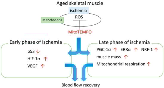 The role of mitochondrial ROS in the regulation of blood flow recovery with ischemia in aging. In aged muscle, mitochondrial ROS induced by ischemia impairs blood flow recovery. Mitochondrial superoxide scavenging improves blood flow related to downregulation of p53, upregulation of HIF-1α and VEGF in the early phase of ischemia, and preservation of PGC-1α, NRF-1, and ERRα in the late phase of ischemia. Scavenging of mitochondrial superoxide with MitoTEMPO is an effective means to preserve blood flow following limb ischemia. Red arrows pointing upwards indicate increase, pointing down indicate decrease of the protein expression, muscle mass and mitochondrial respiration in MitoTEMPO-treated aged muscle compared to non-treated one.
