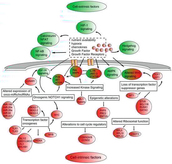 Schematic representation of signaling pathways aberrantly activated in T-cell acute lymphoblastic leukemia (T-ALL), tentatively subdivided as being mainly due to cell-extrinsic (shaded green) and cell-intrinsic factors (shaded red) or mixed (green and red).