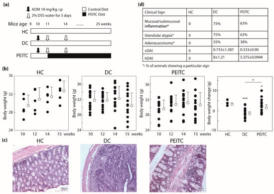 The mice were randomized into three groups, which are described in Figure 1a. For HC and DC groups, mice were given regular diet (5015 diet, LabDiet, St. Louis, MO, USA) for 16 weeks. The same diet was supplemented with 0.12% PEITC for the PEITC-diet test group which they started after first two weeks. PEITC was added to the diet at the facility where the control diet was manufactured using methods that would prevent heat-denaturation of PEITC (LabDiet, St. Louis, MO, USA). DC and PEITC-diet groups were given AOM intra-peritoneally at the beginning of second week. Additional inflammation was induced twice by freshly prepared 2% DSS (ad libitum) in drinking water for five days at the beginning of third week and sixth week, respectively following previously published protocols [38,39]. Mice were observed and recorded individually for their general health conditions and clinical sign assessment, including body weight, vDAI and hDAI as described in Dey et al. [22]. All mice were weighed before and after intraperitoneal injection with AOM and DSS cycles.
