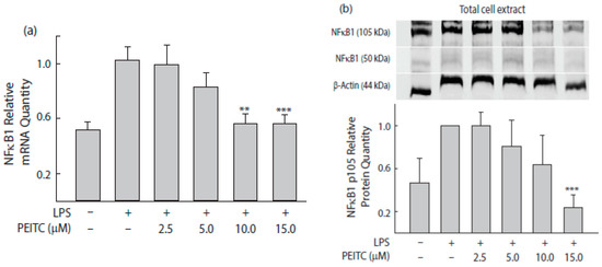 PEITC concentration-dependent mRNA expression of chemokines/cytokines. The effects of PEITC treatments were measured by the relative mRNA quantity expressed by chemokine/cytokine genes in the treated cells. Lower values represent greater inhibitory effects. Values are mean ± S.E. (n = 3). ** p < 0.01, *** p < 0.001 compared with positive-control cells (LPS activation normalized to a value of 1.00). LPS, lipopolysaccharide.