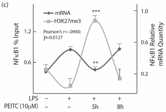 Chronic inflammation linked with cancer is associated with NFκB and its effectors’ pathways. The concentration-dependent suppression of NFκB1 mRNA upon PEITC exposure was further substantiated by concentration dependent NFκB1 protein inhibition (Figure 3b). Since tri-methylation of H3 at lysine 27 (H3K27me3) is frequently associated with transcriptional repression of genes, we further evaluated changes in H3K27me3 levels near the NFκB1 promoter region and observed an inverse association (r = −0.940, p = 0.013) with a time-dependent changes in NFκB1 mRNA expression (Figure 3c). At 5 h PEITC exposure time, the expression level of NFκB1 mRNA was the lowest with corresponding highest level of H3K27me3 detected near its promoter. A PEITC-concentration dependent increase of H3K27me3 was also observed.