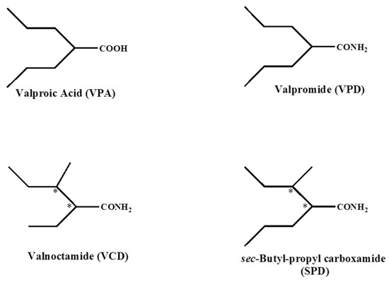 To avoid the side effects including liver toxicity and teratogenicity and to retain its wide antiepileptic spectrum of efficacy of the drug, several derivatives of VPA have been developed. The amide of the chiral constitutional isomer of valpromide (VPD; Figure 1; the amide of VPA) valnoctamide (VCD; Figure 1) is a central nervous system (CNS)-active drug [12,13,14] that shows a low biotransformation to the corresponding acid-valnoctic acid (VCA) [12,15,16]. This is different from VPD, which undergoes rapid transformation to VPA in humans. From 1964 until 2005 in several European countries, VCD (racemate) was commercially available as the anxiolytic drug Nirvanil® [13,17]. In its chemical structure, VCD has two stereogenic centers (Figure 1). The mixture of both stereoisomers of VCD (racemate) has been reported to have a wide spectrum of anticonvulsant activity at concentrations that are 2–16 times lower than VPA and are dependent on the epilepsy model [13]. When intraperitoneally administered at seizure onset, 65 mg/kg VCD protected against pilocarpine-induced status epilepticus (SE) in the rat model [18]. However, this protection was lost when administered at 80 mg/kg 30 min after seizure onset [19], but it did block the pilocarpine-induced electrographic SE at the higher dose of 180 mg/kg [20,21]. In contrast to VPA, racemic-VCD, its corresponding acid VCA, and two of its individual stereoisomers, (2R,3S)-VCD and (2S,3S)-VCD, did not show any significant teratogenic effects in SWV/Finn mice—an inbred mouse strain that is highly susceptible to VPA-induced teratogenicity [22,23]. sec-Butylpropylacetamide (SPD, Figure 1) is a one-carbon homologue of valnoctamide (VCD, Figure 1). SPD has been recently reported by us to show a unique and broad-spectrum antiepileptic profile, which is better (lower ED50 values) than VPA and even superior to VCD in some epilepsy models [19,20]. Additionally, SPD blocked the behavioral and electrographic SE induced by the muscarinic agonist pilocarpine, and the organophosphates soman and paraoxon and showed in vivo neuroprotection that was associated with cognitive sparing [19,20,24,25].