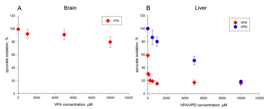 Inhibition of mitochondrial pyruvate oxidation by valproic acid in rat brain mitochondria (A) and rat liver mitochondria (B). Mitochondria (0.04–0.05 mg protein/mL for brain or 0.2 mg/mL protein/mL for liver) were preincubated for 3 min in presence of 1 mM ATP, 5 mM MgCl2 with the indicated amount of VPA. The maximal rate of respiration was determined in presence of 10 mM pyruvate, 5 mM malate, and 1 mM ADP. The plotted rates are averages of three independent experiments. VPD