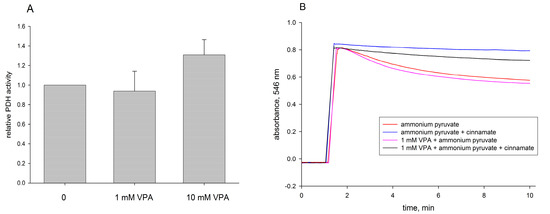 Effect of VPA on pyruvate dehydrogenase activity (A) and pyruvate transport activity (B) of isolated rat liver mitochondria. Liver mitochondria (2.8–3.6 mg protein/mL) were preincubated for 3 min in presence of 1 mM ATP, 5 mM MgCl2 with the indicated amount of VPA. (A) The plotted pyruvate dehydrogenase (PDH) activities are averages of three independent experiments; (B) Swelling of mitochondria in 0.1 M ammonium pyruvate buffer. One representative experiment (out of 3) is shown. Red trace: control; pink trace: 1 mM VPA; blue trace: 1 mM cinnamate; black trace: 1 mM VPA and 1 mM cinnamate. Experimental conditions as described in Materials and Methods.