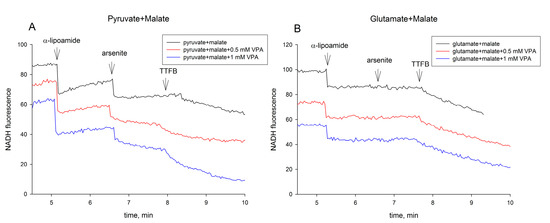 Effect of VPA on pyruvate (A) and glutamate (B) dependent arsenite-sensitive re-reduction of NAD(P)+ by α-lipoamide dehydrogenase. Representative experimental traces of mitochondrial NAD(P)H fluorescence showing re-reduction of NAD(P)+ after α-lipoamide (75 µM) additions (first arrow). α-Lipoamide dehydrogenase is blocked by addition of 10 mM arsenite (second arrow). Finally, the uncoupler 4,5,6,7-tetrachloro-2-trifluoromethyl benzimidazole (TTFB, third arrow) was added. The detailed experimental conditions are described in the Materials and Methods section.