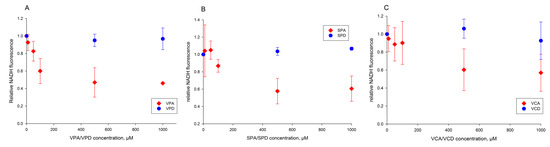 Dose-dependency of effects of VPA and its derivatives on pyruvate-dependent reduction of NAD(P)+ by α-lipoamide dehydrogenase. (A) Red diamonds, VPA; blue circles, VPD. (B) Red diamonds, SPA; blue circles, SPD. (C) Red diamonds, VCA; blue circles, VCD. Experimental conditions as indicated in Figure 5.