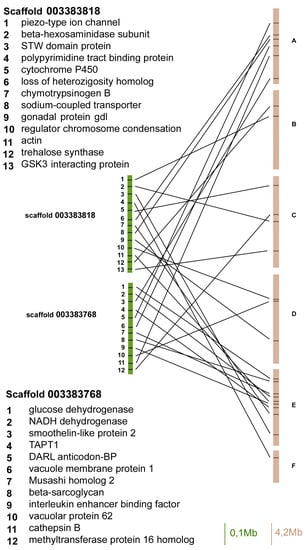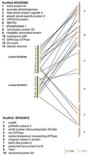 The scaffold 003383512 presented 10 orthologous genes in A. pisum and D. melanogaster, and five of them mapped on the fruit fly Muller element B, whereas the other ones were located in elements A, C, and E (Figure 1).