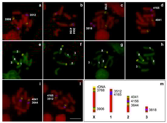 Double fluorescent in situ hybridization (FISH) with fluorescein isothiocyanate (FITC)-labelled 3906 (a), 4156 (b), 3768 (c), and 4041 (d) probes (in green) and with aminomethylcoumarin acetate (AMCA)-labelled 3512 (a), 3644 (b), 3818 (c), and 4165 (d) probes (in blue) allowed the mapping of the A. pisum scaffolds on the chromosomes, counterstained with propidium iodide (in red). In order to define the reciprocal position on chromosomes, double FISH experiments with FITC-labelled 4041 (i) and 3512 (l), and AMCA-labelled 3644 (i) and 4165 (l) probes have also been performed. Chromomycin A3 staining (e–h) allowed the identification of the X chromosomes in each plate. A schematic representation (m) allowed the comparison of the localization of each scaffold on the A. pisum chromosomes. 3906: scaffold 003383906. 4156: scaffold 0033844156. 3768: scaffold 003383768. 4041: scaffold 003384041. 3512: scaffold 003383512. 3644: scaffold 003383644. 3818: scaffold 003383818. 4165: scaffold 003384165. Bar corresponds to 100 μm.