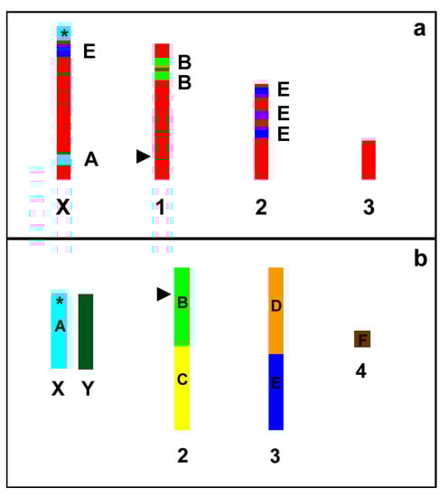 - Sved, J.A.; Chen, Y.C.; Shearman, D.; Frommer, M.; Gichrist, A.S.; Sherwin, W.B. Extraordinary conservation of entire chromosomes in insects over long evolutionary periods. Evolution 2016, 70, 229–234. [Google Scholar] [CrossRef] [PubMed]