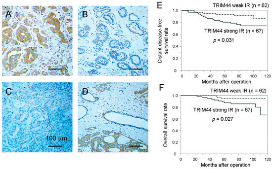 Relationship between TRIM44 immunoreactivity and prognosis of patients. (A) Representative micrograph of a breast cancer case with strong TRIM44 immunoreactivity (IR). TRIM44 was stained in the cytoplasm of cancer cells. The scale bar represents 100 μm. (B) Representative micrograph of a breast cancer case with negative TRIM44 IR. The scale bar represents 100 μm. (C) Representative micrograph of a breast cancer tissue applied non-specific rabbit IgG antibody as a negative control. The scale bar represents 100 μm. (D) Example of the tissue sample where TRIM44 IR was strong in the cancerous region and weak in the morphologically benign glands and stroma. The scale bar represents 100 μm. (E) Distant disease-free survival of breast cancer patients with strong or weak TRIM44 IR was shown by the Kaplan–Meier method. The solid line represents cases with strong TRIM44 IR, and the dashed line represents cases with weak TRIM44 IR. The statistical significance was evaluated using the log-rank test. (F) Overall survival of breast cancer patients with strong or weak TRIM44 IR was shown by the Kaplan–Meier method. The solid line represents cases with strong TRIM44 IR, and the dashed line represents cases with weak TRIM44 IR. The log-rank test was performed.