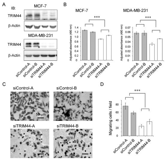 Effects of TRIM44 knockdown on proliferation and motility of breast cancer cells. (A) Western blot analysis of TRIM44 knockdown efficiency in MCF-7 and MDA-MB-231 cells. Two kinds of siRNAs for TRIM44 (siTRIM44-A and -B) as well as siRNAs not targeting human transcripts (siControl-A and -B) were used. β-Actin protein was blotted as an internal control. IB, immunoblot. (B) Inhibitory effect by siTRIM44 on the proliferation of MCF-7 and MDA-MB-231 cells. MTS assay was performed at day five after transfection of siRNAs. Results are expressed as mean ± SEM (n = 4). *** p < 0.001 (two-way ANOVA). (C) Inhibitory effect by siTRIM44 on the motility of MDA-MB-231 cells. Cells were incubated for 24 h after transfection of siRNAs, and migration during the next 24 h was evaluated. Cells on the lower side of the filters were stained by the Giemsa stain solution and visualized under microscope at a magnification of 400×. Representative photographs of migrating are shown. The scale bars indicate 50 μm. (D) Cells migrating to the lower surface of the filters were counted in five fields. Results are expressed as mean ± SEM (n = 5). *** p < 0.001 (two-way ANOVA).