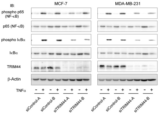 The crosstalk between TRIM44 and the NF-κB signaling pathway has been reported in malignancies such as lung cancer cells [18] and hepatic cancer cells [22]. NF-κB has pathological relevance in malignancies, as it is known to protect cancer cells from apoptosis and to facilitate cell survival [24]. We thus evaluated the effects of TRIM44 on the NF-κB signaling pathway by western blot analysis and a luciferase reporter assay. TRIM44 knockdown caused attenuated phosphorylation of the p65 subunit of NF-κB and NF-κB inhibitor α (IκBα) on TNFα stimulation in both MCF-7 and MDA-MB-231 breast cancer cells (Figure 3). The reporter assay revealed TRIM44 knockdown significantly impaired NF-κB-mediated transcriptional activity stimulated by tumor necrosis factor α (TNFα) in both MCF-7 (Figure S2A) and MDA-MB-231 (Figure S2B) breast cancer cells. Elevated NF-κB-mediated transcriptional activity was observed in TRIM44 transfected breast cancer cells compared to mock transfected cells (Figure S2C,D). These data suggested that TRIM44 could enhance NF-κB signaling.
