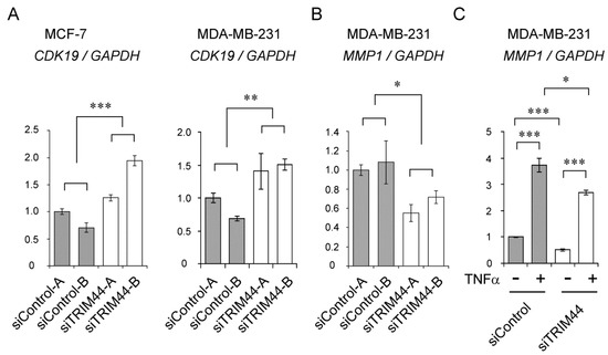 Regulation of CDK19 and MMP1 expression by TRIM44. (A) Knockdown of TRIM44 significantly increased CDK19 mRNA expression in MCF-7 and MDA-MB-231 cells. siRNAs (10 nM) were transfected by the reverse-transcription method 42 h before harvesting cells. mRNA expression levels were normalized with GAPDH by the 2−ΔΔCt method. ** p < 0.01, *** p < 0.001 (two-way ANOVA). (B) Knockdown of TRIM44 significantly decreased MMP1 mRNA expression in MDA-MB-231 cells. siRNAs (10 nM) were transfected by the reverse-transcription method 42 h before harvesting cells. mRNA expression levels were normalized with GAPDH by the 2−ΔΔCt method. * p < 0.05 (two-way ANOVA). (C) Expression of MMP1 is induced by TNFα treatment. Transfection of siControl-B (siControl) and siTRIM44-B (siTRIM44) was performed by the reverse-transfection method at a concentration of 2 nM. 24 h after transfection, the cells were treated with TNFα (50 ng/mL) or vehicle (phosphate-buffered saline) for another 24 h before harvest. mRNA expression levels were normalized with GAPDH by the 2−ΔΔCt method. * p < 0.05, *** p < 0.001 (t-test).
