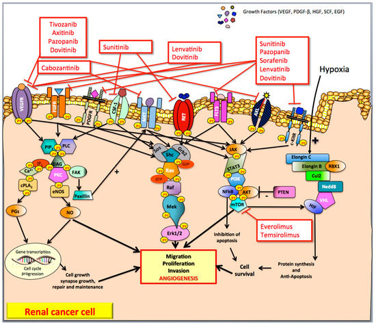 The RAS-MAPK pathway is a fundamental controlling of the phosphoinositide-3-kinase PI3K/AKT/mTOR (mammalian target of rapamycin) pathway. This pathway induces the Janus kinase (JAK)/signal transducer and the (STAT) pathway, which represents a central regulator of the proliferation of RCCs. The PI3K/AKT/mTOR pathway is activated in RCC and its blockade by rapamycin and/or everolimus and temsirolimus has been shown to inhibit the growth of RCC [14].