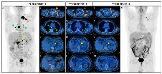 18F-FDG PET/CT TKIs therapy evaluation in a 52-year-old man affected by metastatic RCC six months after surgery resection of the right kidney. The 18F-FDG PET/CT-1 [MIP (A); and axial fused PET/CT (B–E)] detected several cervical (SUVmax 17.7, orange arrows), mediastinal (SUVmax 13.2, green arrows) and abdominal (SUVmax 16.7, yellow arrow) lymph nodes (A–C), as well as recurrent disease in right renal loggia (SUVmax 11.9, red arrow) (E) at baseline. The 18F-FDG PET/CT-2 [axial fused PET/CT (F–I)] performed after 1 cycle of TKIs demonstrated partial but early disease response with persistent 18F-FDG uptake in cervical (SUVmax 12.2-orange arrows), mediastinal (SUVmax 3.4, green arrows) and abdominal (SUVmax 6.7, yellow arrow) lymph nodes (F–H) and increased metabolism in right renal loggia (I), despite only slight reduction in size. In the 18F-FDG PET/CT-3 [MIP (N); and axial fused PET/CT (J–M)] performed after six months of TKIs therapy, only a persistent cervical (SUVmax 6.8, orange arrows) lymph node (J) was detectable. Other lymph nodes were still recognized on CT examination but they were glucose metabolism-free ((J) upper orange arrow; and (L) yellow arrow). 18F-FDG PET/CT, 18F-fluoro-2-deoxy-2-d-glucose positron emission tomography/computed tomography; TKIs thyrosin kinase inhibitors, RCC, renal cell carcinoma.