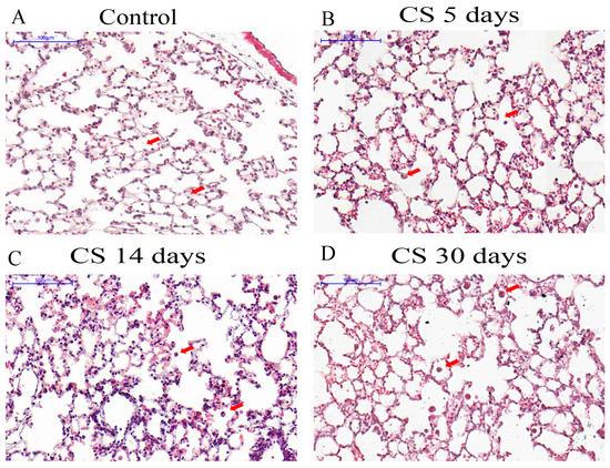 Photomicrographs of lung sections stained with hematoxylin and eosin. Bars are equal to 100 μm. (A) Control group (air exposed); (B) Mice exposed to cigarette smoke (CS) for 5 days; (C) Mice exposed to CS for 14 days; (D) Mice exposed to CS for 30 days. Arrowheads represent leukocytes in alveoli.