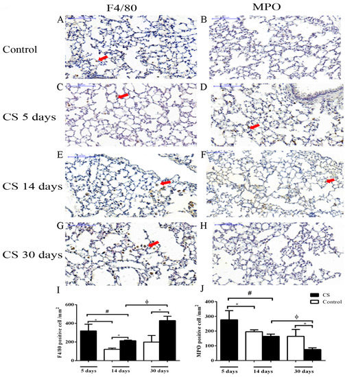 Lung sections were examined by light microscopy to observe the temporal effects of CS in lung tissue. Occasional alveolar macrophages were observed in control mice lung sections (Figure 1A). The lungs from CS 5 days presented cells in the alveoli and alveolar septa (Figure 1B) and cell infiltration was more pronounced in the lungs from mice exposed to CS for 14 days (Figure 1C) and CS 30 days (Figure 1D) when inflammatory cells were more numerous. To investigate the type of inflammatory cell found in the lung tissue after CS exposure, the number of F4/80-positive macrophages (Figure 2A,C,E,G,I) and myeloperoxidase (MPO)-positive neutrophils (Figure 2B,D,F,H,J) were quantified. We observed an increase in macrophages, with a peak of the cell number at 30 days of CS exposure (Figure 2I). The neutrophil number was only increased compared to control group after 5 days CS exposure (Figure 2J). In contrast, the number of these cells was lower in the 30 days of CS group than in the control group.